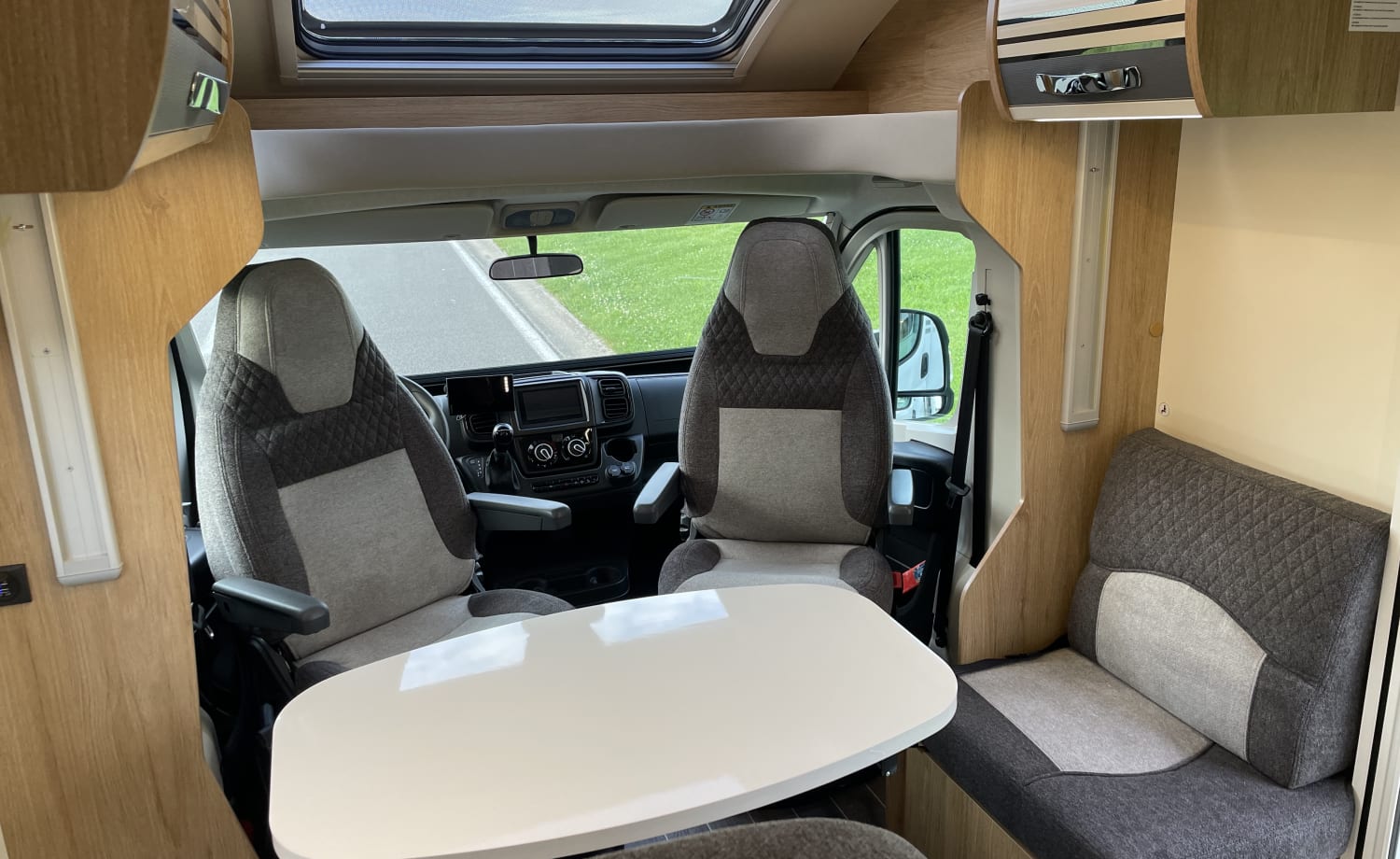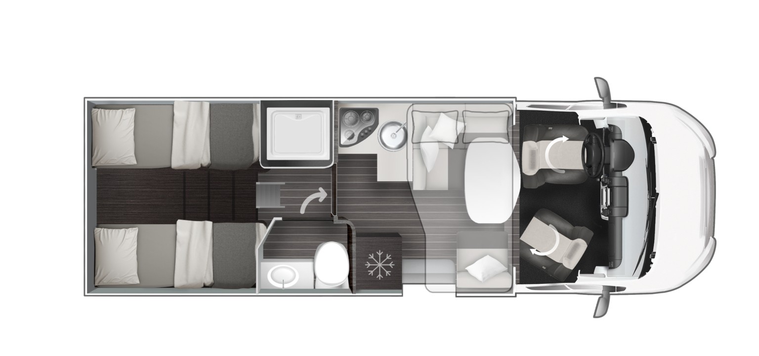 Sistem Traction Plus, kamero za vzvratno vožnjo, pliseji v kabini, širša vhodna vrata z oknom, sončna celica 120W, komarniki in zatemnitev na vseh oknih in vratih, hladilnik 148L (220V-12V-Plin) z ločenim zamrzovalnikom in predalom za steklenice, ogrevanje Truma Kombi 4 in električna prednja postelja.