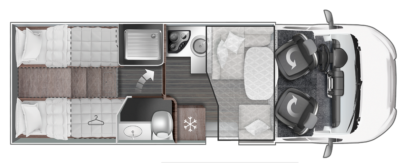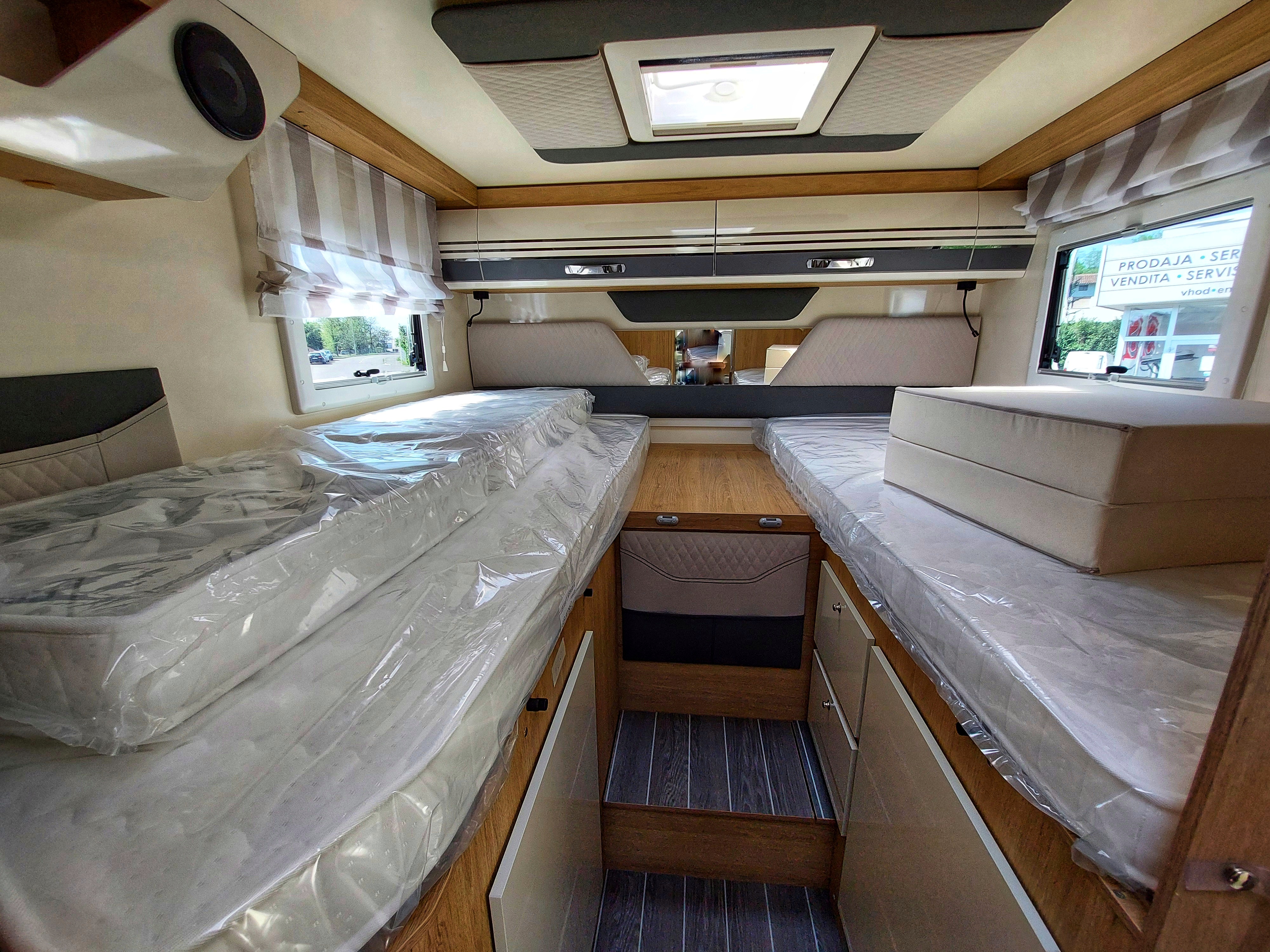 Traction plus, kamera za vzvratno vožnjo dvojna, pliseji kabine, širša vhodna vrata z oknom, električna prednja postelja, zvočniki tudi v bivalnem delu, rezervoar goriva 90l, truma INET APP, komarniki na oknih in vratih, hladilnik 145L z zamrtovalnikom, tenda.